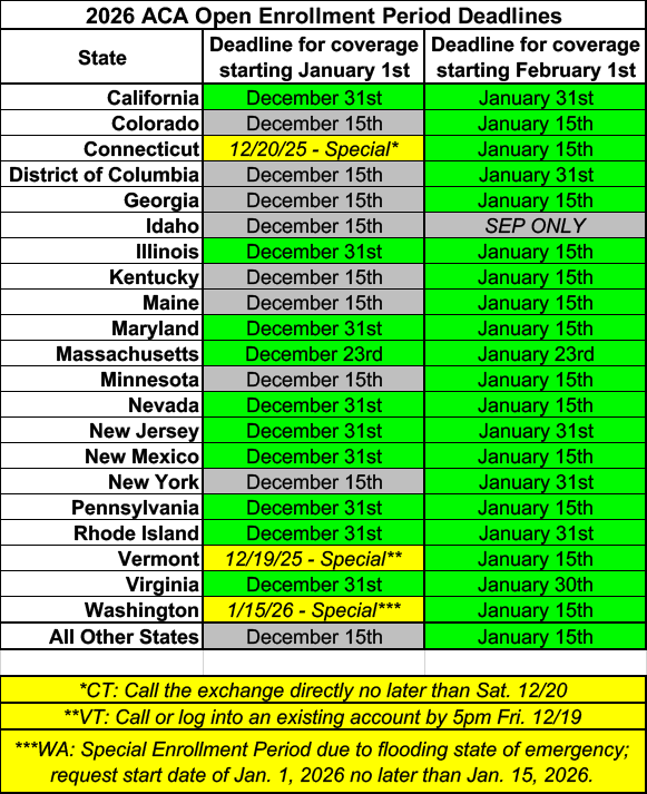 Since we're past the initial December 15th Open Enrollment Deadline for coverage starting January 1st in most states and since there's been several enrollment deadline extensions announced by various states (including two more today), I figured this would be a good time to post a completely updated rundown of just what the remaining deadlines are for every state as well as what your options are if you miss them.