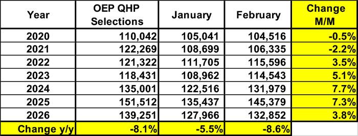 The first thing to notice is that while total Open Enrollment Period plan selections dropped by 8.1% from 2025 to 2026, effectuated enrollment as of February has dropped even more, by 8.6%. This is also reflected in the January - February effectuated change, which has increased each year since 2022, but only increased about half as much in 2026 (+3.8%) vs. 2025 (+7.3%).