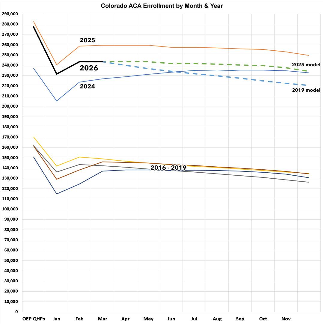 Connect for Health Colorado, the state's ACA exchange, has published effectuated enrollment data for January, February and March 2026, so it's time to dig in and see what this might say about national trends.