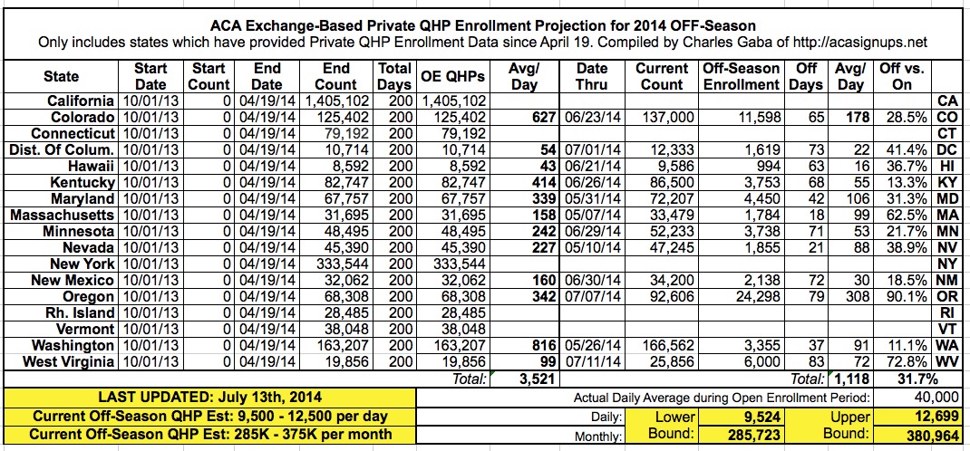 With the unexpected addition of QHP updates from 2 Federal Exchange-based states over the weekend (West Virginia and New Mexico), I've updated the Off-Season QHP Projection spreadsheet again, and now have it sitting at a range of between 9,500 - 12,500 additional exchange-based QHPs per day, or 285K - 375K per month:
