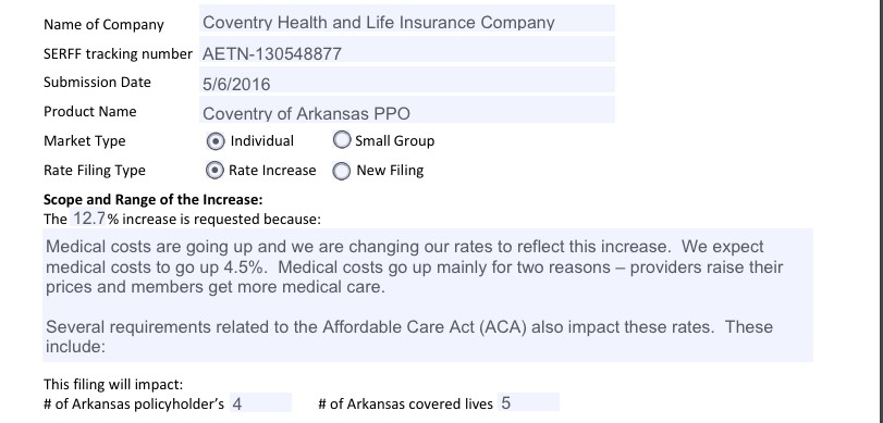 So just last Friday I posted the weighted average requested rate hikes for the Arkansas individual market; it came in at 14.9% overall, which is actually one of the lower statewide averages this year. As a reminder, here's what how the breakout looks: