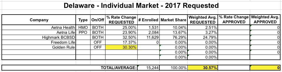 Delaware is a small state, and only has a total of 4 carriers offering individual polcies (2 on exchange, 2 off). One of those, however, is once again "Freedom Life" which, once again, is asking for precisely a 17.37% rate hike on their almost-certain-to-be-nonexistent enrollees. So...never mind them. That leaves Aetna (split into HMOs and PPOs) and Highmark BCBS offering policies on the exchange, and Golden Rule off the exchange.