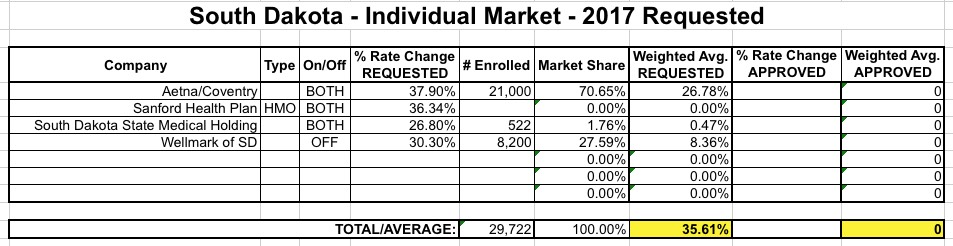 Only 4 carriers appear to be participating in the ACA-compliant individual market in South Dakota next year: Aetna, Sanfrod, SD State Medical and Welmark. I only have the enrollment numbers for 3 of the 4, but the requested rate hike for the fourth one (Sanford) is pretty close to the average of the other three anyway, so it shouldn't really impact the overall average by much: