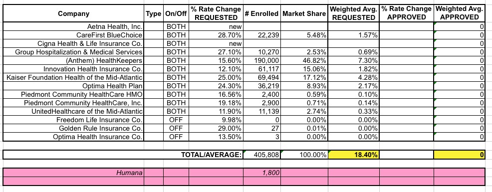 There have, however, been a few other changes to some of the rate filings here and there, found via this updated PDF on the VA DOI website as of July 19th. The overall average requested hikes don't really change much, but do nudge a bit higher than I had previously estimated, from 17.5% to 18.4%: