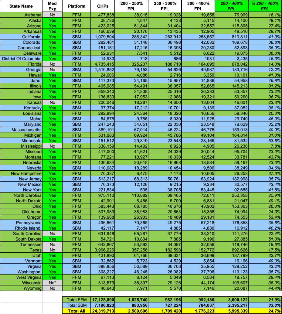 Since there's so many income bracket columns and there's a lot to delve into for many of them, I've broken the full spreadsheet out into three sections/posts. The first focuses on exchange enrollees who earn less than 138% of the Federal Poverty Level (FPL). This is a critical threshold because it's the cut-off point for ACA Medicaid expansion enrollment in the 40 states (+DC) which have expanded it.