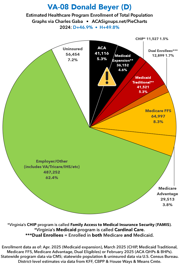 UPDATE 7/15/25: I've updated the web versions of the graphics with the most up-to-date enrollment data I have access to. The black sections w/the ⚠️ symbol are those most at risk of losing healthcare coverage due to H.R. 1, the "One Big Beautiful Bill Act" (aka the #MAGAMurderBill).