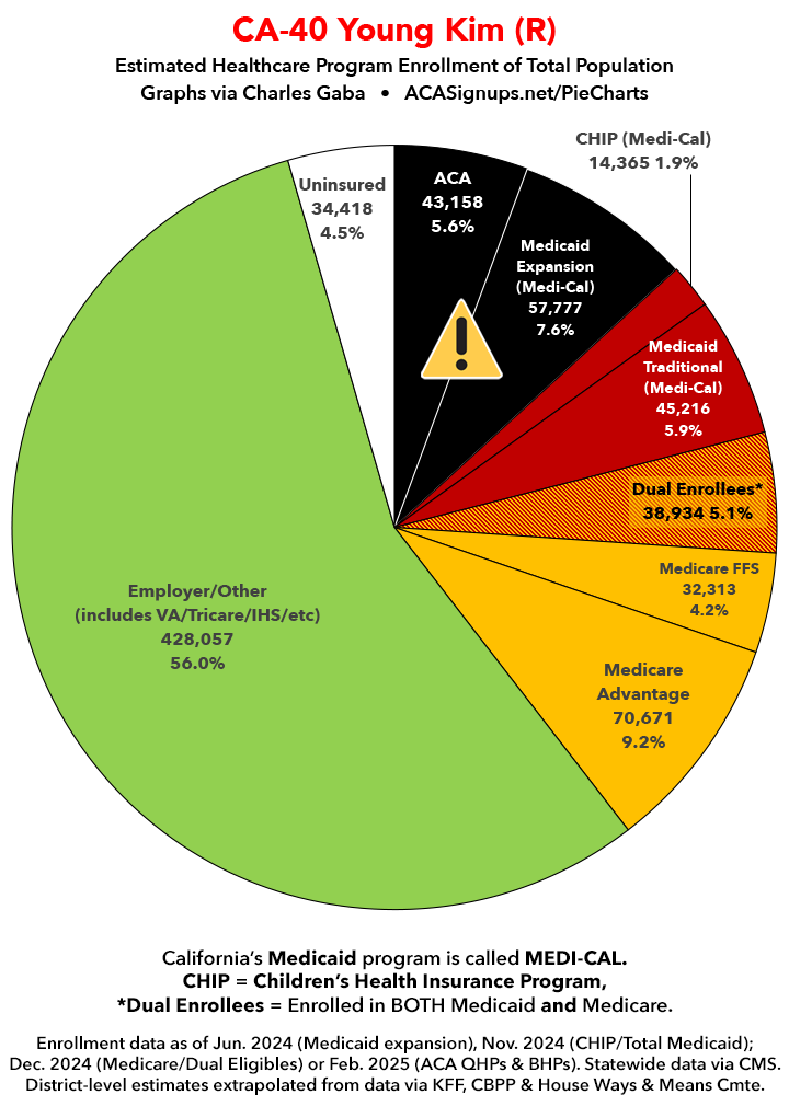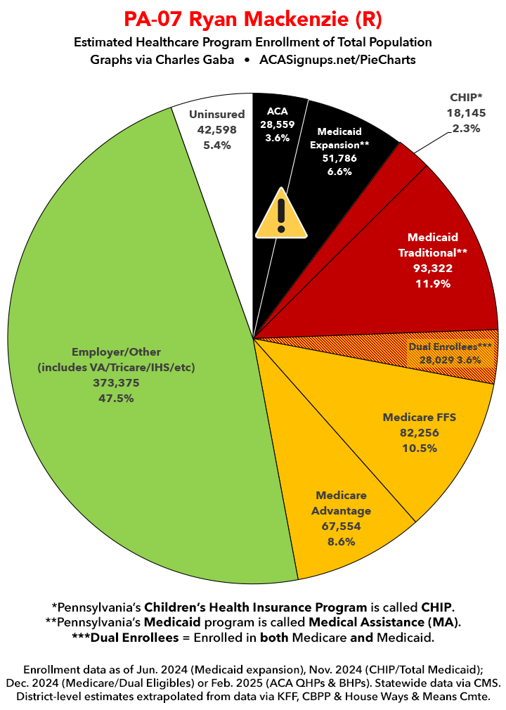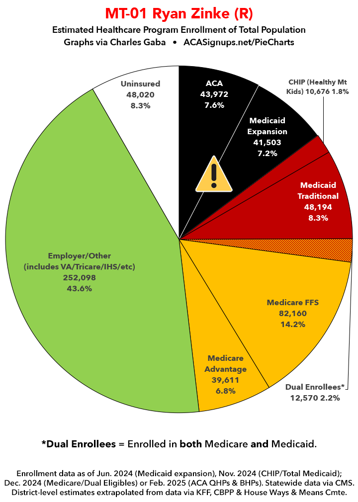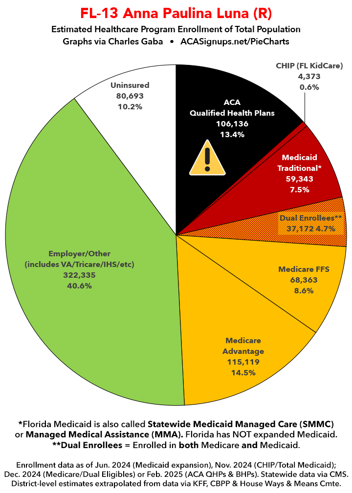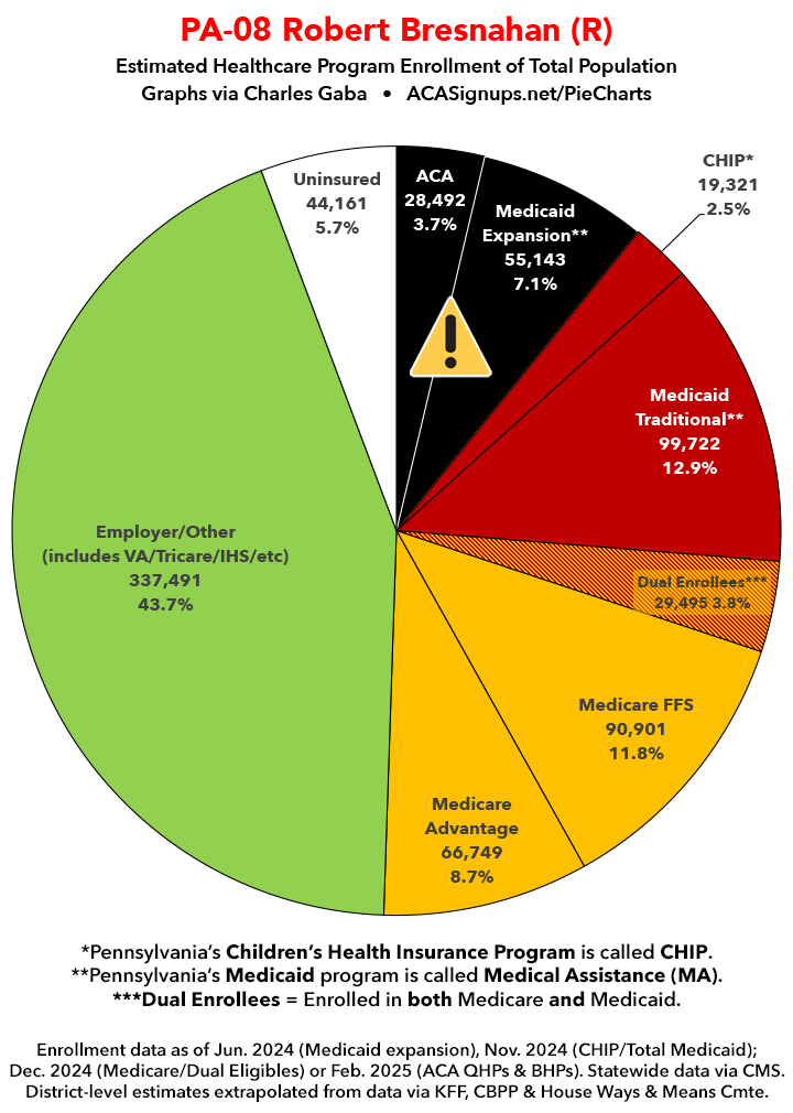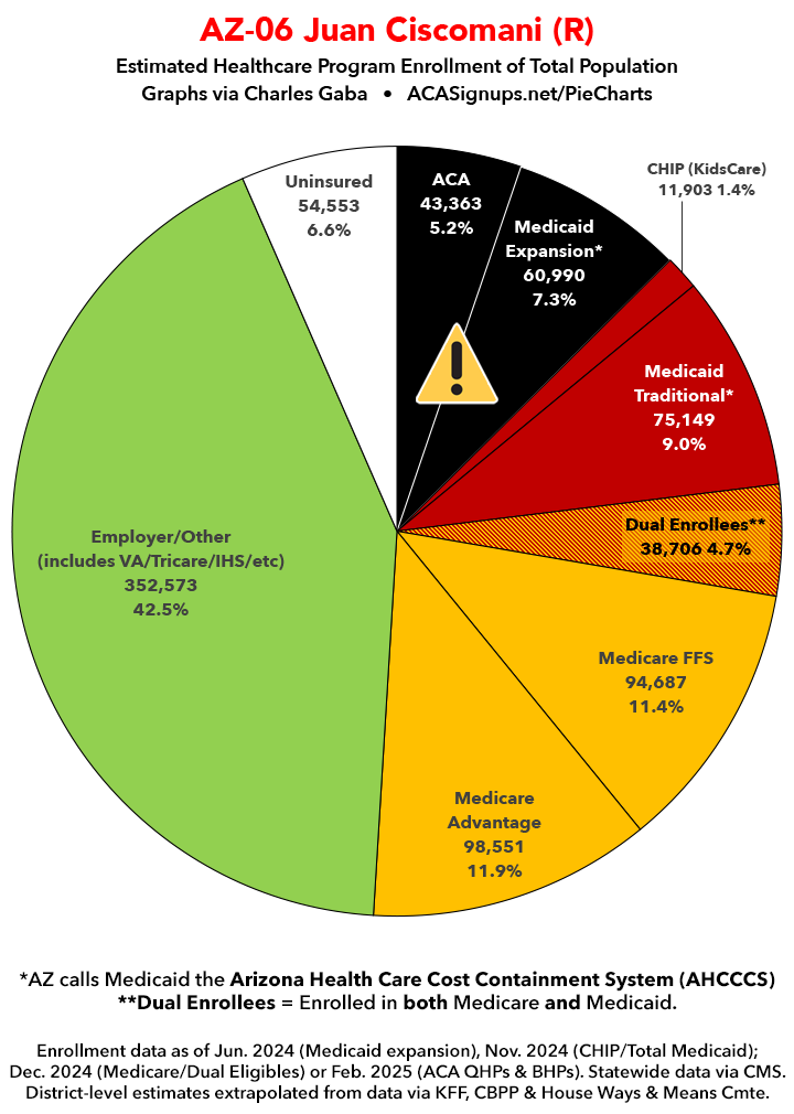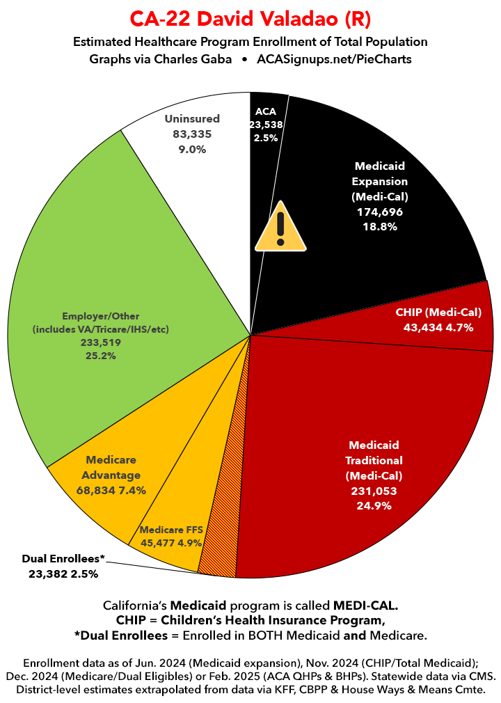 Below I've posted district-wide healthcare coverage enrollment estimates for all 29 of these House districts for reference. On average, at least 11.7% of their total populations (1 out of every ~8.5 residents) is at risk of losing healthcare coverage assuming a) the #MedicaidMassacre bill passes & is implemented and b) the GOP-controlled Congress fails to extend the improved federal APTC subsidies included in the Inflation Reduction Act (IRA) several years ago beyond 2025.