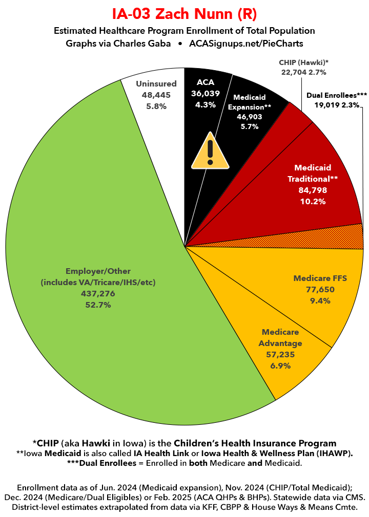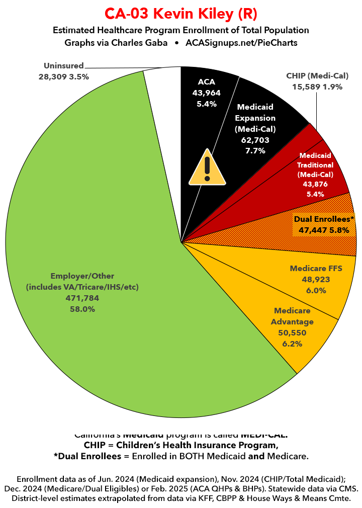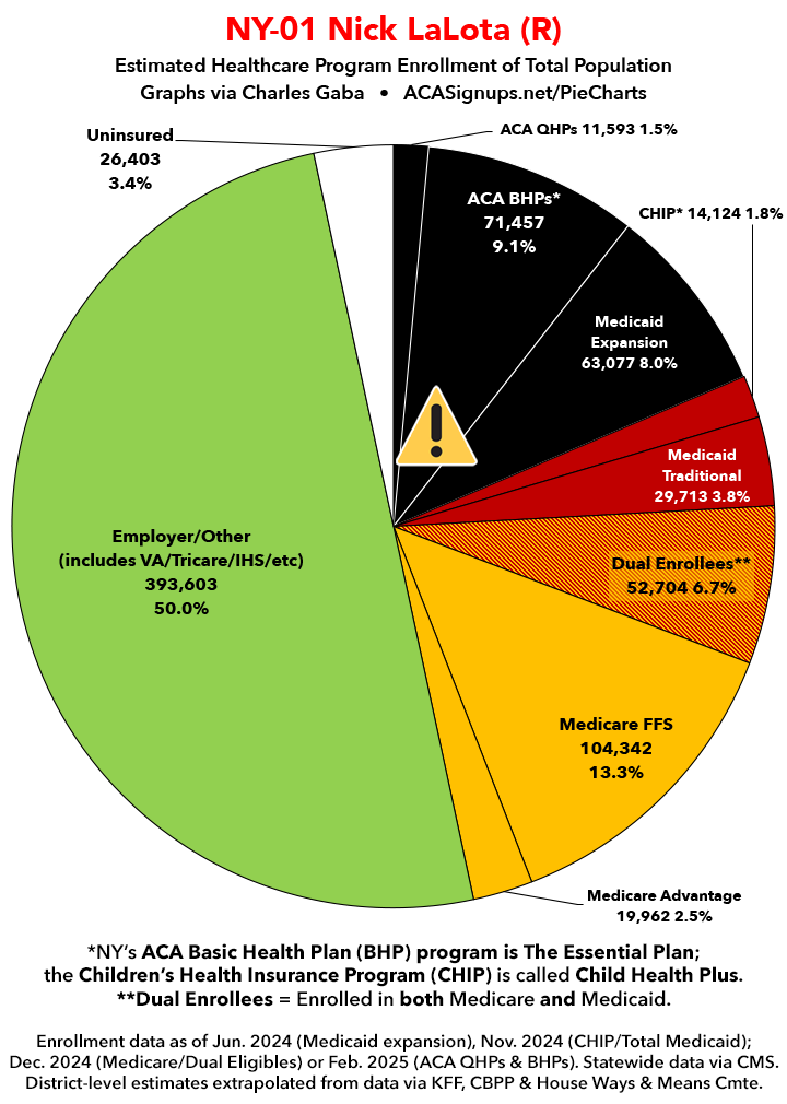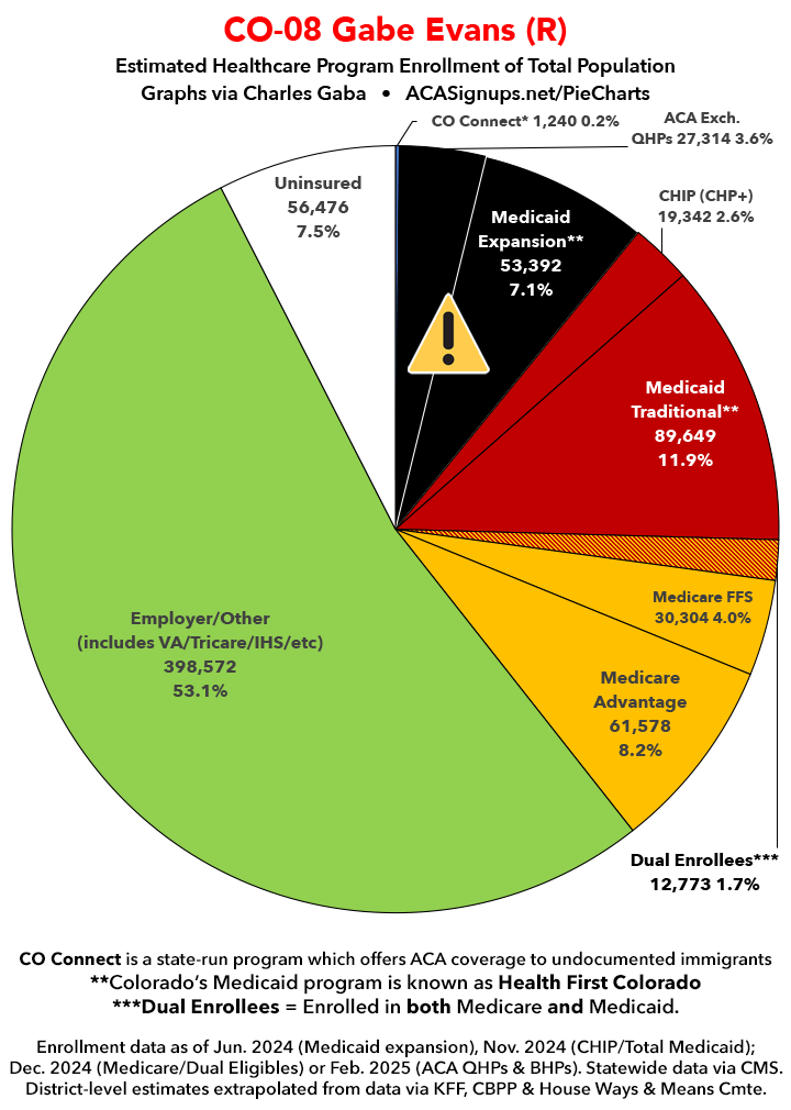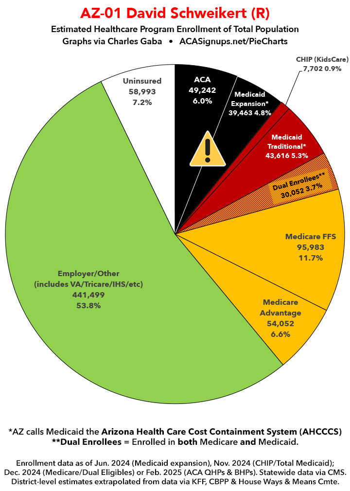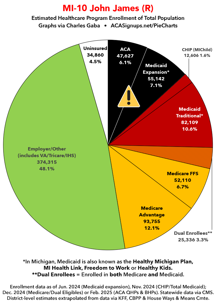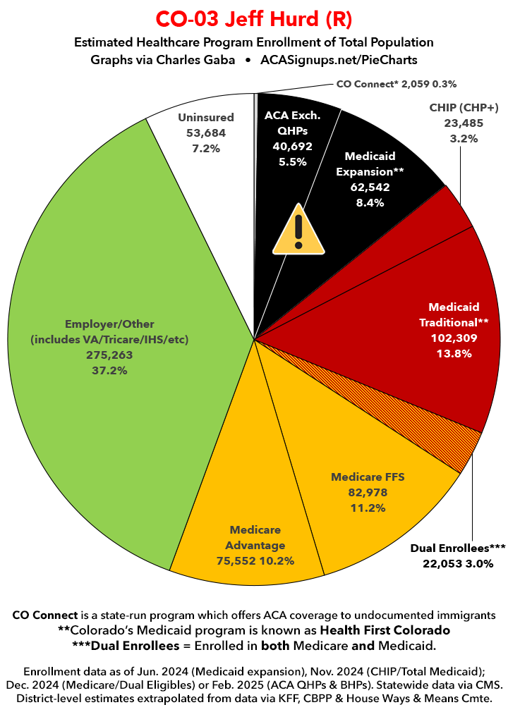 Below I've posted district-wide healthcare coverage enrollment estimates for all 29 of these House districts for reference. On average, at least 11.7% of their total populations (1 out of every ~8.5 residents) is at risk of losing healthcare coverage assuming a) the #MedicaidMassacre bill passes & is implemented and b) the GOP-controlled Congress fails to extend the improved federal APTC subsidies included in the Inflation Reduction Act (IRA) several years ago beyond 2025.