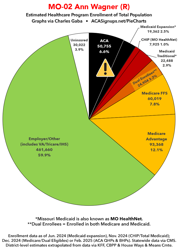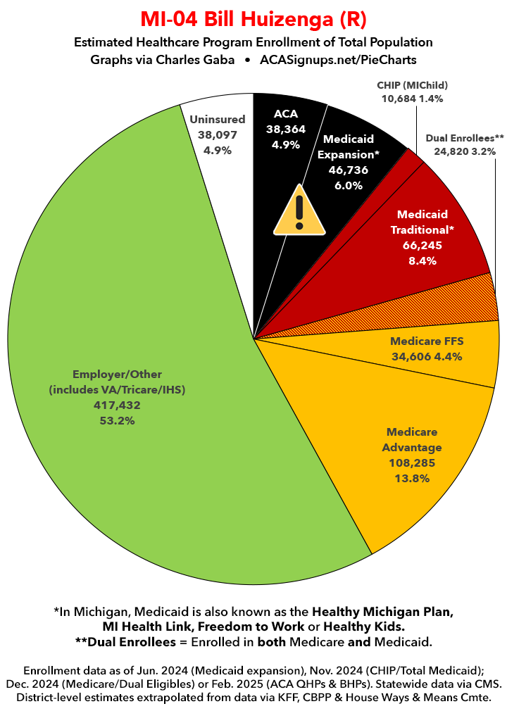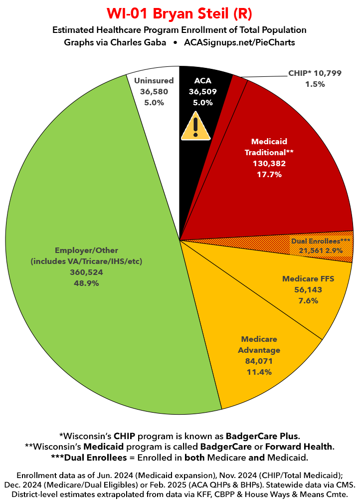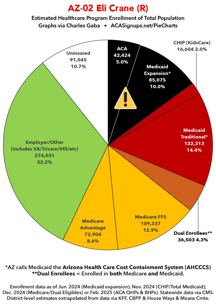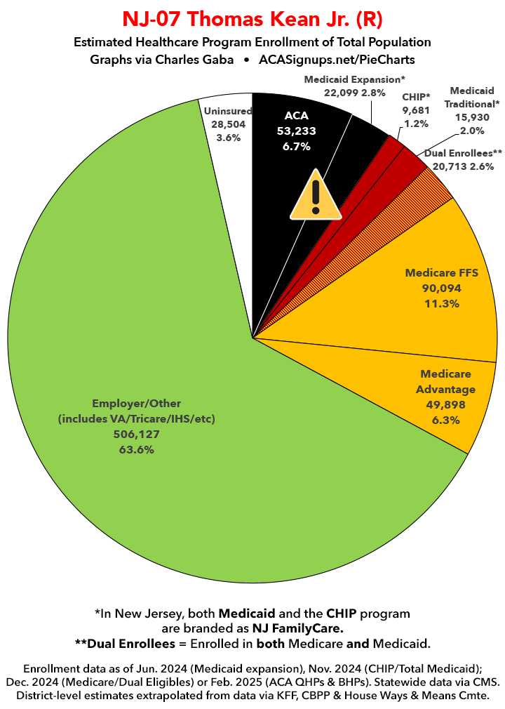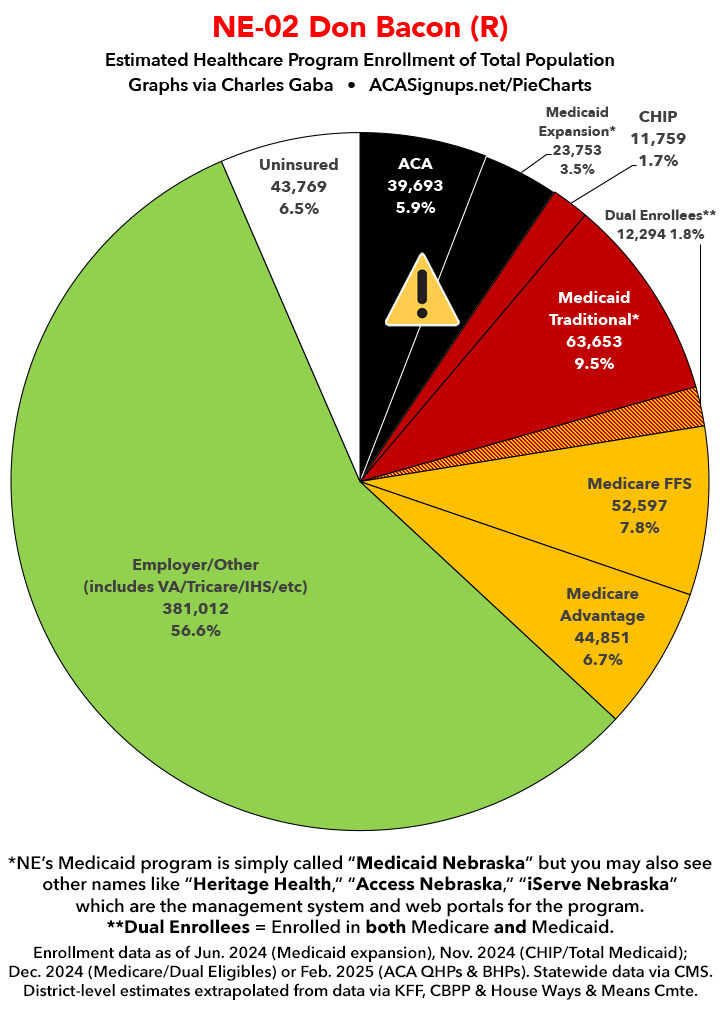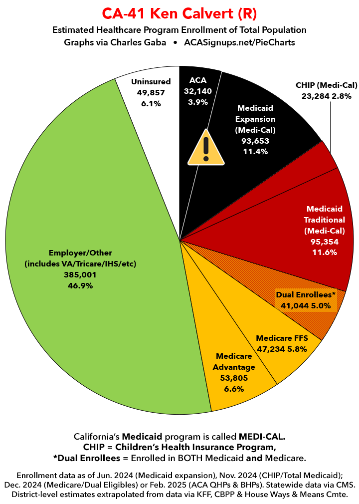 Below I've posted district-wide healthcare coverage enrollment estimates for all 29 of these House districts for reference. On average, at least 11.7% of their total populations (1 out of every ~8.5 residents) is at risk of losing healthcare coverage assuming a) the #MedicaidMassacre bill passes & is implemented and b) the GOP-controlled Congress fails to extend the improved federal APTC subsidies included in the Inflation Reduction Act (IRA) several years ago beyond 2025.