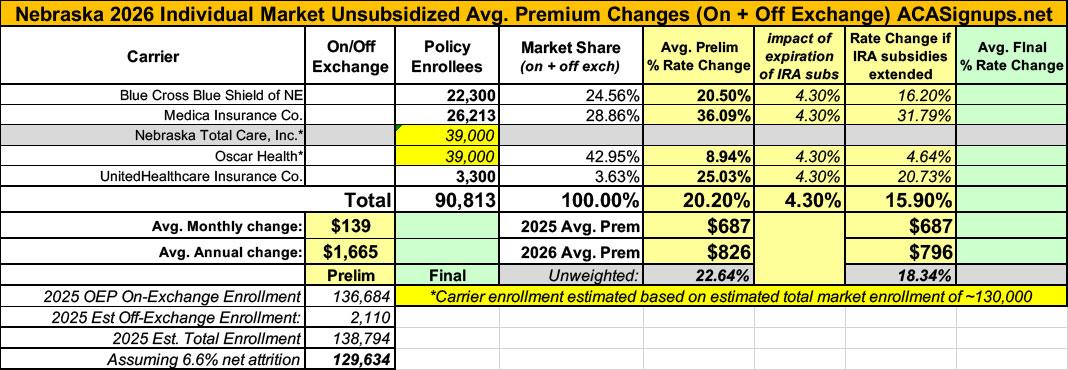 Nebraska has around ~136,000 residents enrolled in ACA exchange plans, 95% of whom are currently subsidized. I estimate they also have another ~2,000 unsubsidized off-exchange enrollees.