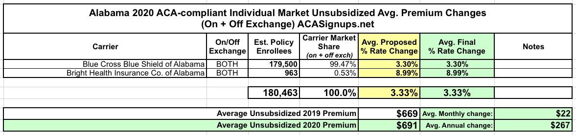 When I first ran the preliminary 2020 ACA premium rate filing requests for Alabama in August, I came up with a weighted average increase of 3.9%.