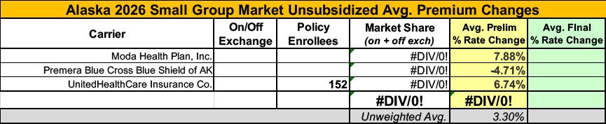 I also have no enrollment data for two of the three small group carriers; the unweighted average 2026 rate hike there is a modest 3.3%.