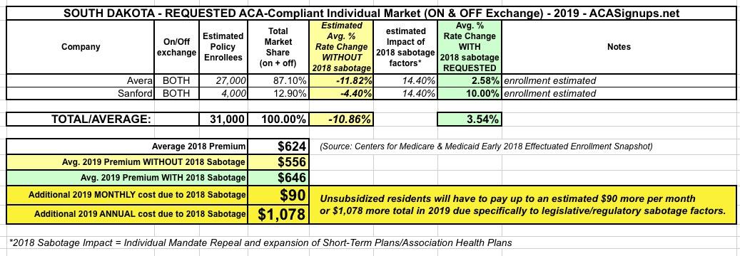 South Dakota has two ACA indy market carriers, Avera and Sanford. The relative enrollment market shares are based on last year's numbers. The 14.4% #ACASabotage impact assumes 2/3 of the Urban Institute's projections to err on the side of caution.